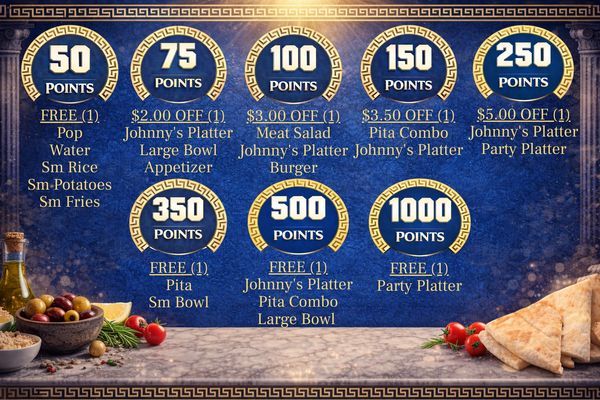 Join Johnny Greeko’s Loyalty Program and get ready to earn points while enjoying all your favourites! As a member, you can earn points every time you visit us in person or order through our website!